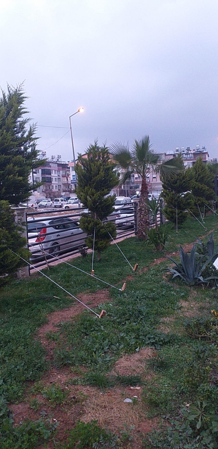 Fırtınadan dolayı eğilen ağaçlar bağlanmış, dik duruma getirilmiştir.
